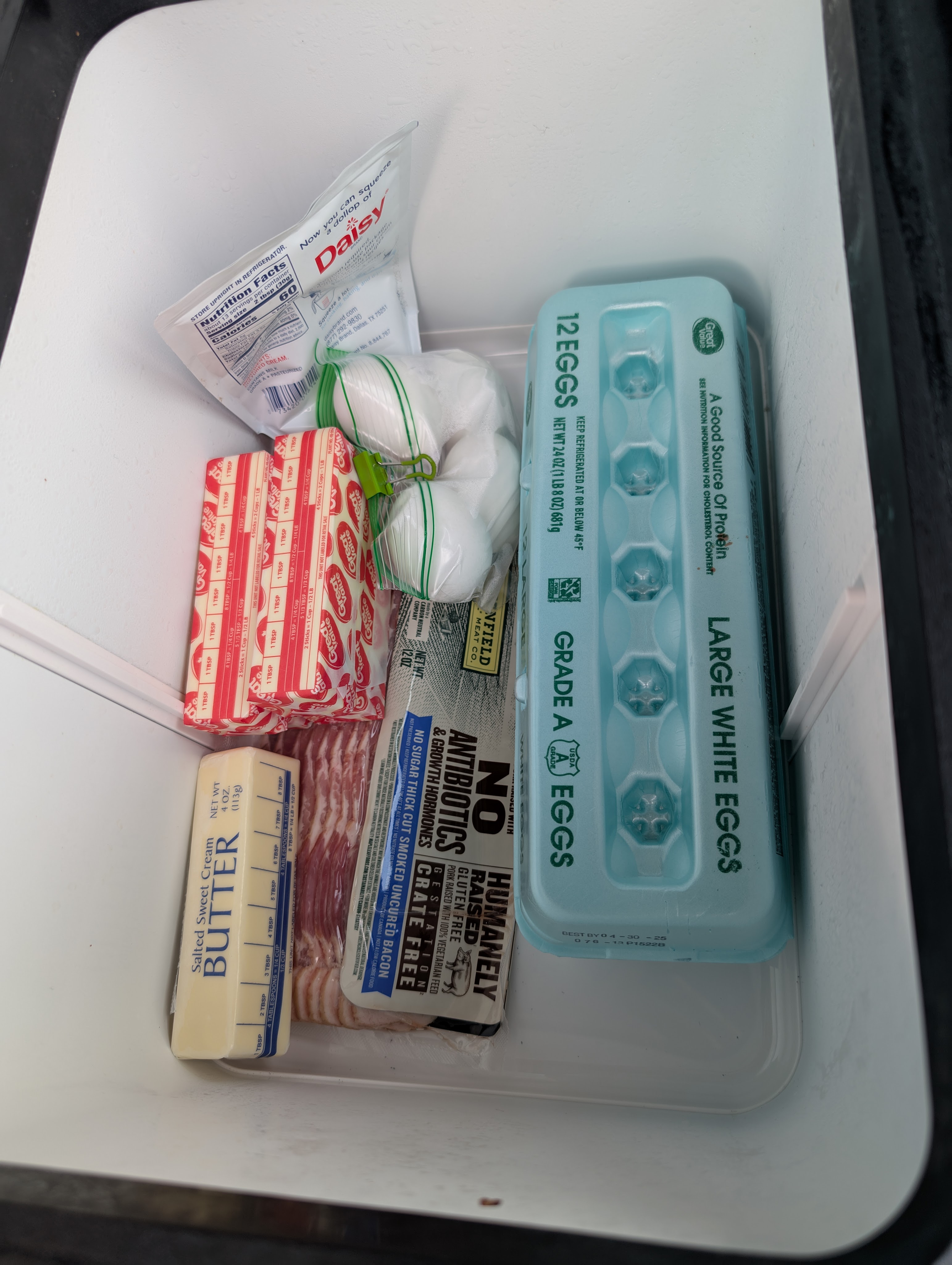 The other day, my neighbor took his truck and trailer out for a test drive. He will be leaving a week before I do. It took him a good hour to load up and disconnect everything. I am so glad that I am in my van. This is my picnic table and the stuff I leave behind when I go to the store. It takes me less than five minutes to disconnect from my site and less than five minutes to set back up!!