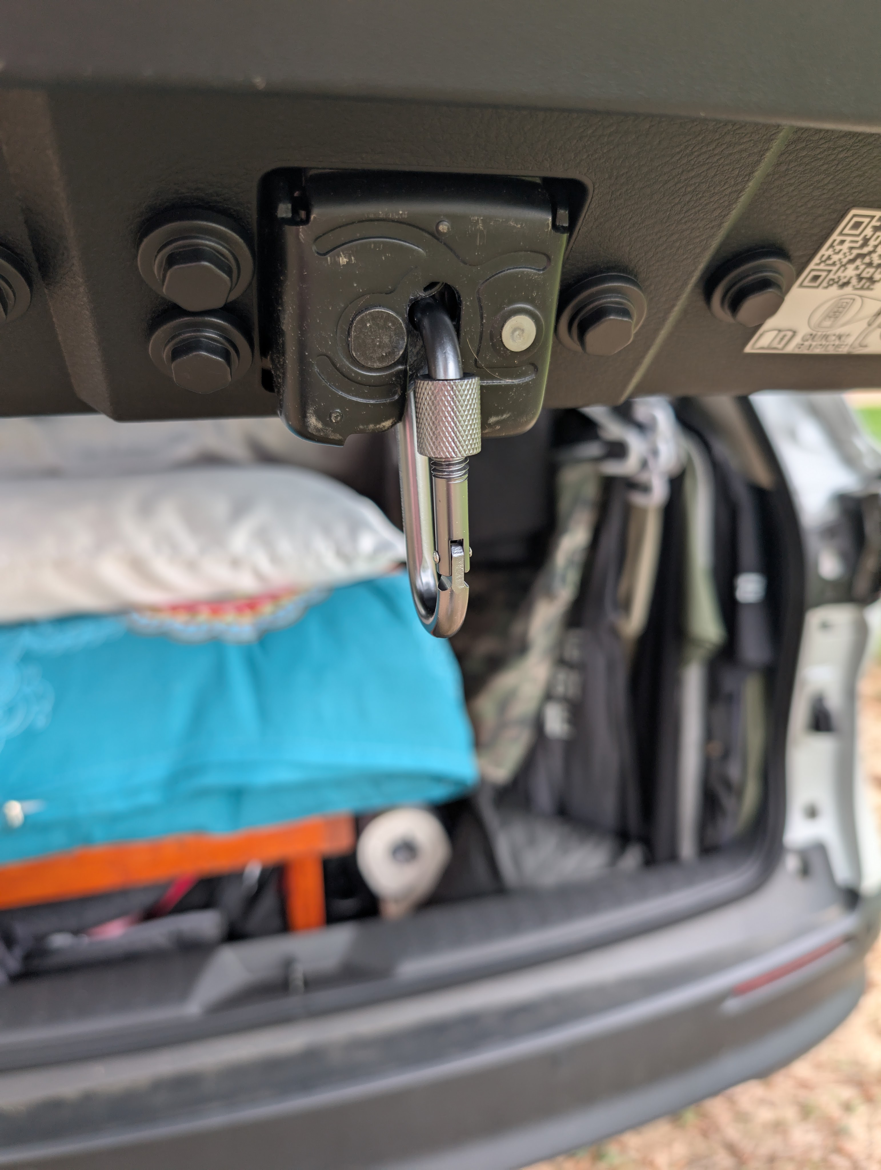 On Saturday, I put a carabiner in the latch of the rear hatch door so that I could keep the hatch partially open for more of a breeze. This would prevent the battery from running down because the van thought the hatch door was open. However, I couldn’t get the carabiner to release and close the hatch for the night. I tried all the buttons to get it to release, but no!!