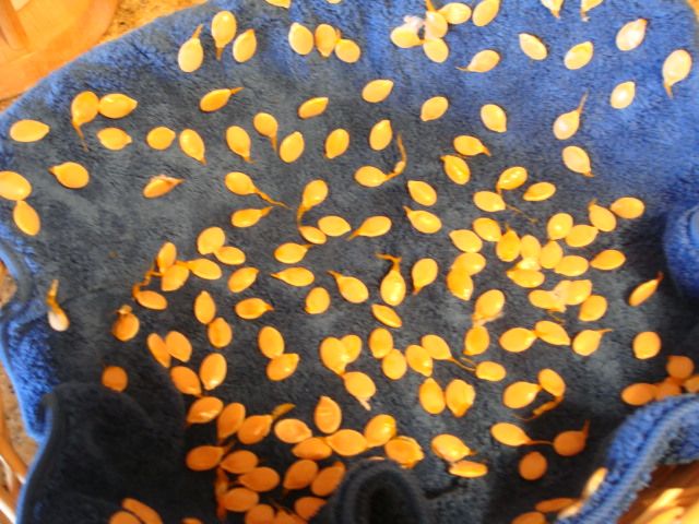 I should have waited for Kymber, because at first I put this sticky mess on some napkins. Then after she mentioned towels, I picked the seeds out of that sticky mess and transfered them to a towel. I’m still digging out small pieces of paper napkin.