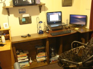 I took off all the removable shelves and the doors and put the bookcase on its side. I removed the top of my old desk with the little shelf and put that on top for my laptop and keyboard. I used one of the shelves under the extra monitor and another to the top of the left side. I will stop somewhere tomorrow to pick up some shelf brackets so that I can put the left over shelves on the wall. Just in case….I saved all the hardware so that I can put it back to what it was, if I want to.