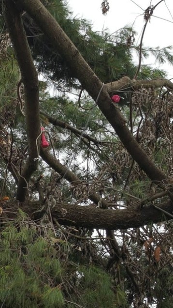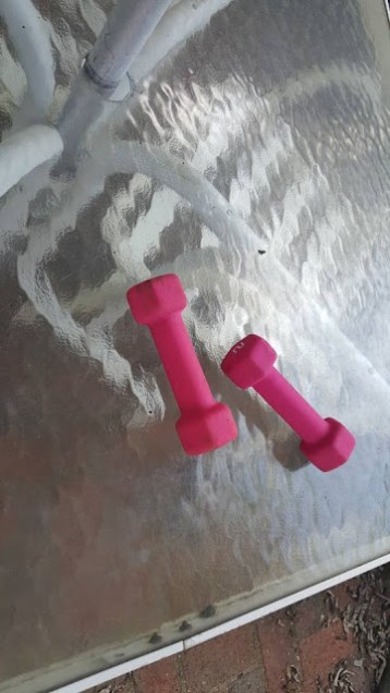 T-jay and I had the idea of attaching a dumb bell that I had, to a rope, then a clothesline, and finally a cable wire. All three of them broke, leaving two pink dumb bells up in the tree.